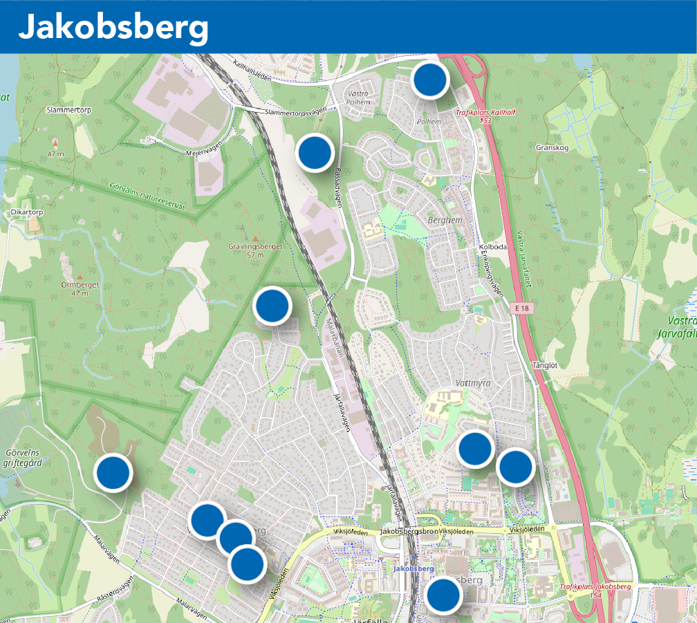 Planerade förtätningar i Jakobsberg (bildkälla Openstreetmap)