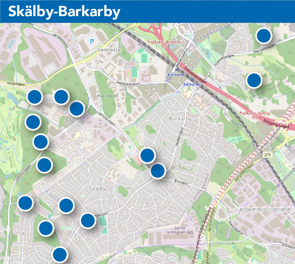 Planerade förtätningar i Skälby-Barkarby (bildkälla Openstreemap)
